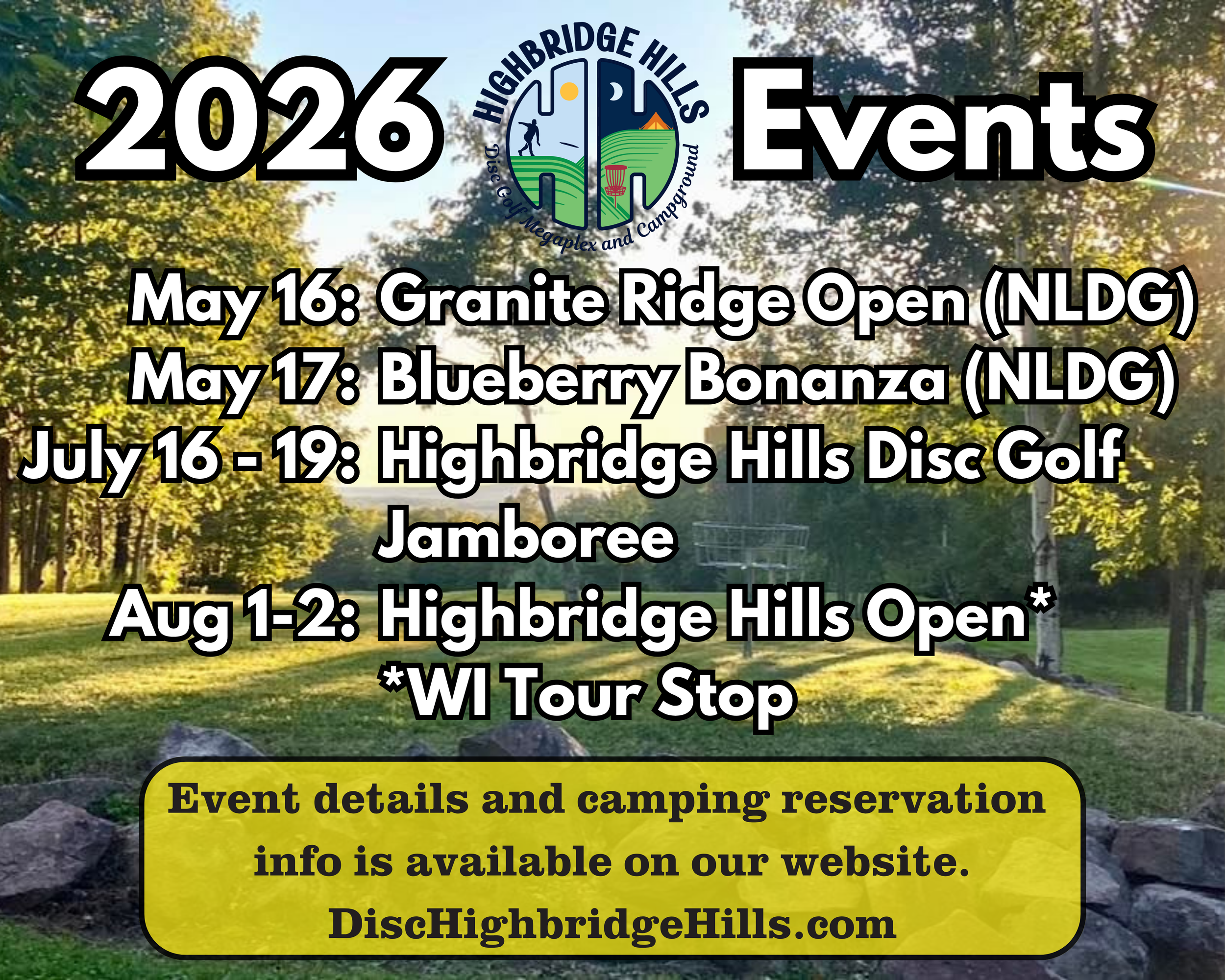 Highbridge Hills will remain open to the public for disc golf and camping during all tournament weekends. No more than 2 courses will be closed for tournament play at any given time.